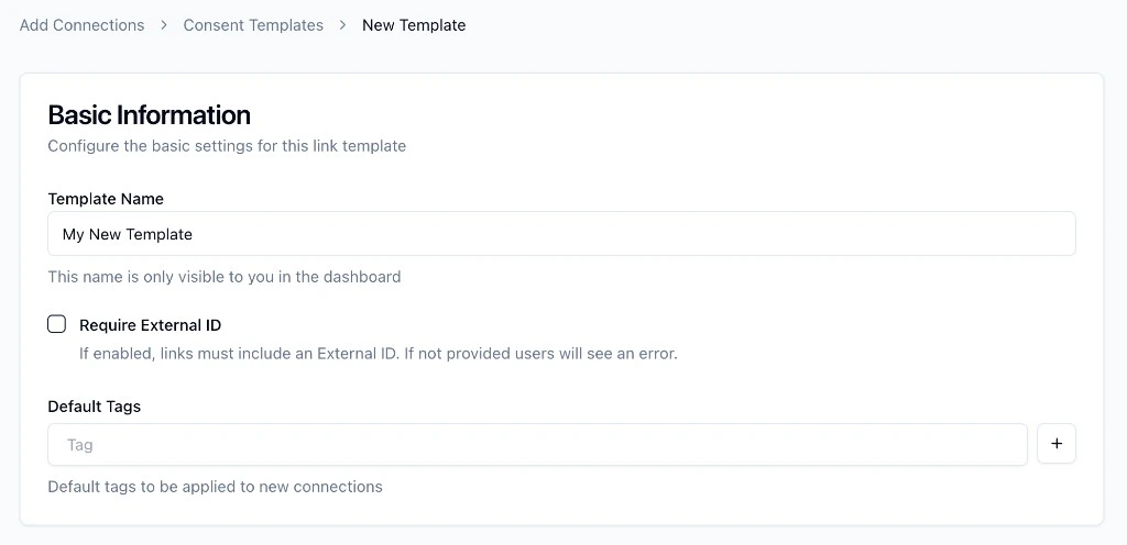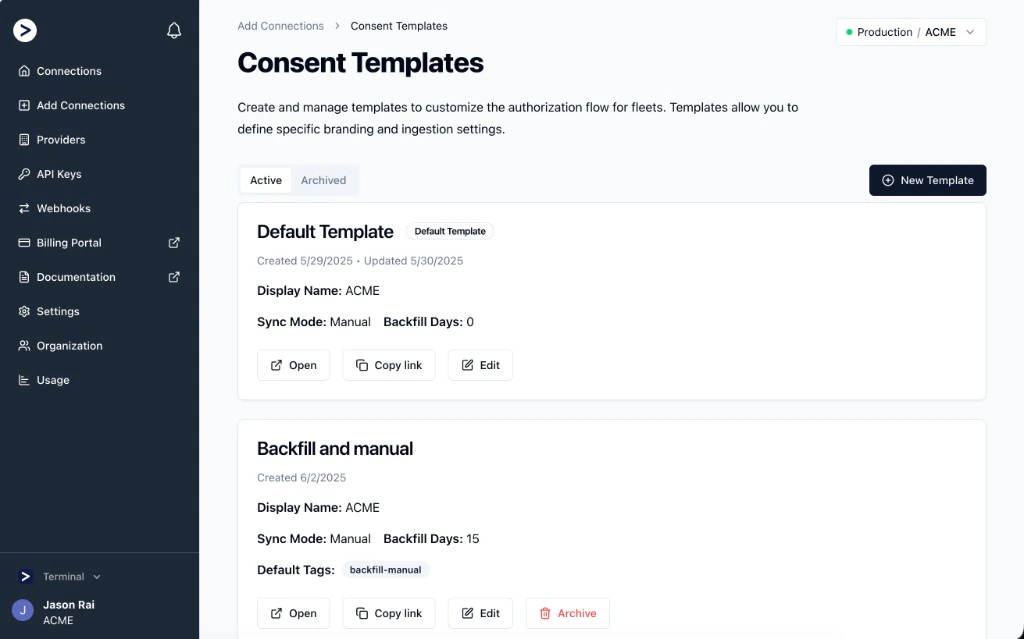 You can create and manage templates from Add Connections -> Consent Templates in the Terminal dashboard. From the templates page you can:- Create a new template