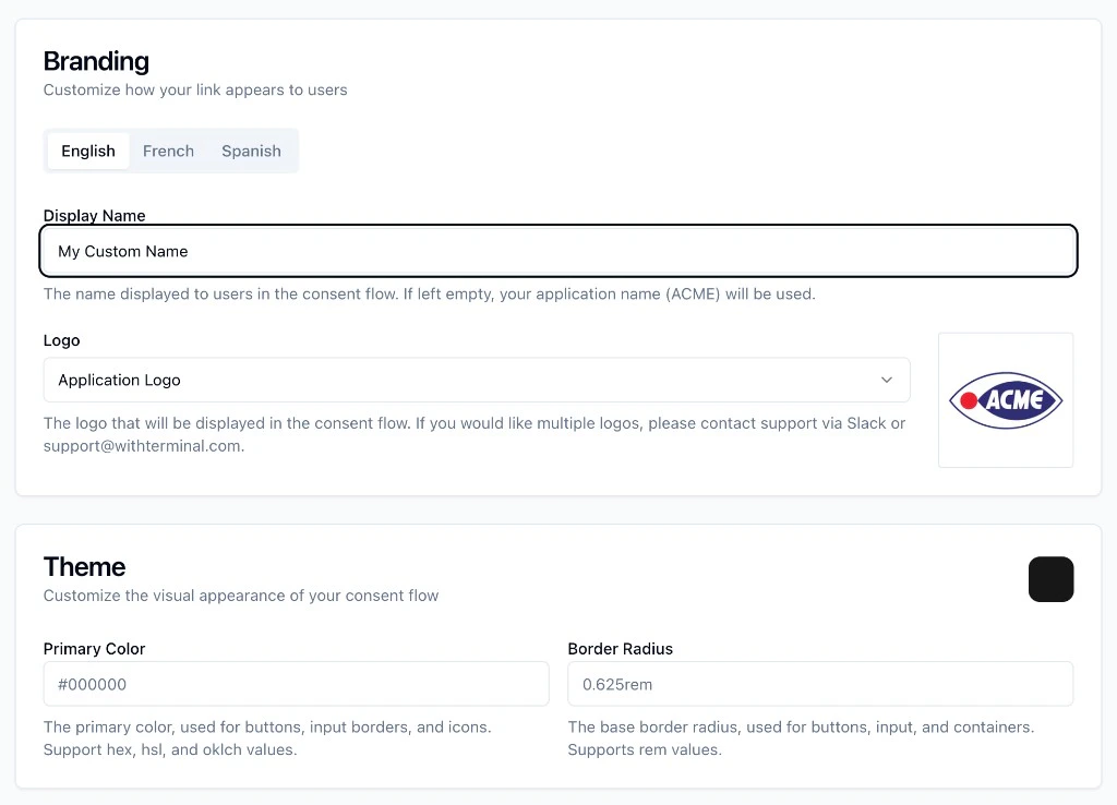 ltp_... - Uploaded logos and custom end user agreements appear in the template editor when available for your application. New logos or agreements must be uploaded by Terminal support before they can be selected here. To request new ones, contact support@withterminal.com.