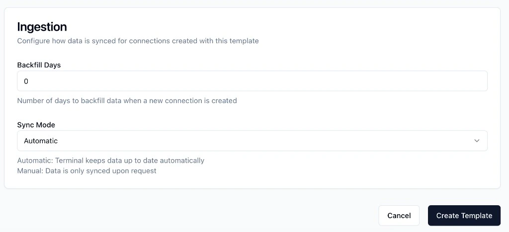 Templates define defaults, but you can still override some values at launch time.redirect_urloverrides the template’s success redirect URL for that launchsync_modeoverrides the template’s sync mode for that launchbackfill_daysoverrides the template’s backfill setting for that launchtagspassed at launch are combined with the template’s default tags